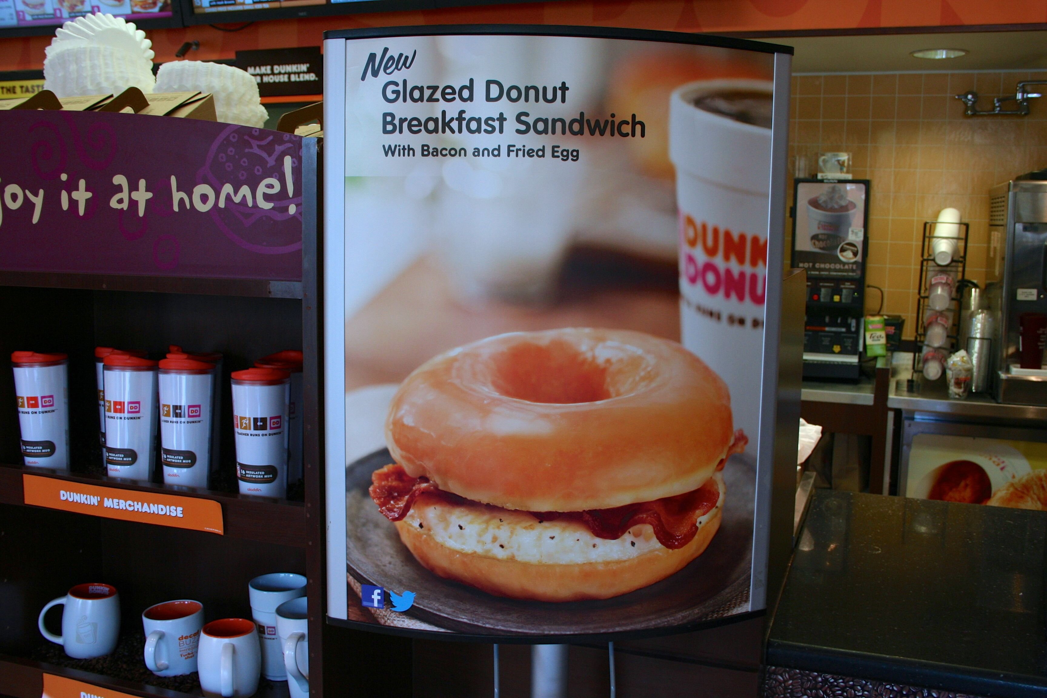 First Taste Dunkin Donuts Totally Healthy New Bacon N Egg Glazed Donut Breakfast Sandwich Thrillist